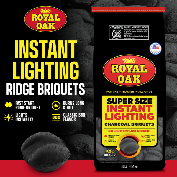Super Size™ Instant Lighting Charcoal Briquets are Royal Oak’s® biggest ridge briquet! Super Size™ Instant Lighting briquets are infused with lighter fluid so they light instantly with just a